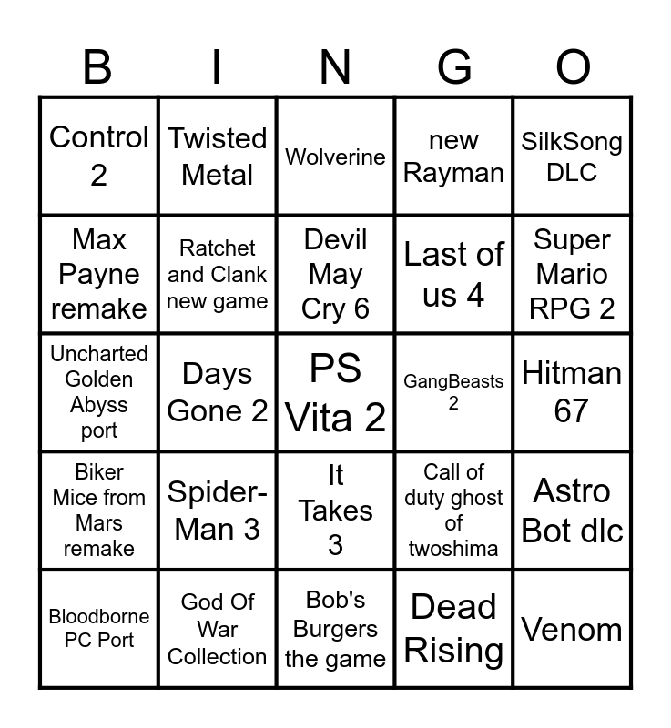 This bingo card has a free space and 24 words: Spider-Man 3, God Of War Collection, Devil May Cry 6, Bloodborne PC Port, SilkSong DLC, Control 2, Max Payne remake, Twisted Metal, GangBeasts 2, It Takes 3, Last of us 4, Uncharted Golden Abyss port, Call of duty ghost of twoshima, Astro Bot dlc, Ratchet and Clank new game, Dead Rising, Hitman 67, Wolverine, Super Mario RPG 2, Days Gone 2, Venom, Biker Mice from Mars remake, new Rayman and Bob's Burgers the game.