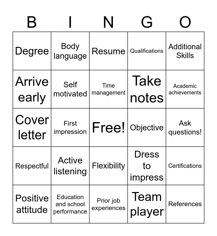 This bingo card has a free space and 24 words: Active listening, Education and school performance, Time management, Positive attitude, Additional Skills, Degree, Arrive early, Body language, Objective, Flexibility, Take notes, Cover letter, Dress to impress, Certifications, Self motivated, Team player, Ask questions!, Resume, Academic achievements, First impression, References, Respectful, Qualifications and Prior job experiences.