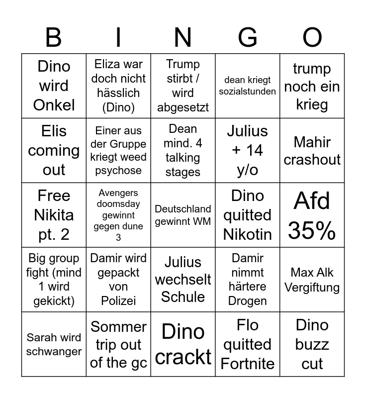 This bingo card has 25 words: Damir wird gepackt von Polizei, Dino crackt, Dean mind. 4 talking stages, Sarah wird schwanger, trump noch ein krieg, Dino wird Onkel, Elis coming out, Eliza war doch nicht hässlich (Dino), Dino quitted Nikotin, Julius wechselt Schule, Julius + 14 y/o, Free Nikita pt. 2, Damir nimmt härtere Drogen, Max Alk Vergiftung, Einer aus der Gruppe kriegt weed psychose, Dino buzz cut, Afd 35%, Trump stirbt / wird abgesetzt, Mahir crashout, Avengers doomsday gewinnt gegen dune 3, Deutschland gewinnt WM, Sommer trip out of the gc, Big group fight (mind 1 wird gekickt), dean kriegt sozialstunden and Flo quitted Fortnite.