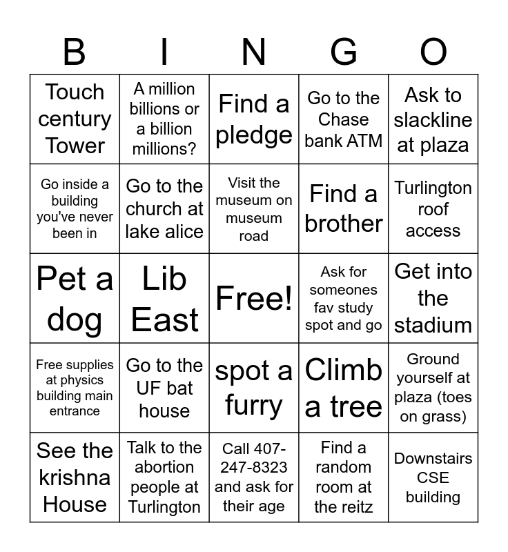 This bingo card has a free space and 24 words: Go to the UF bat house, Talk to the abortion people at Turlington, Visit the museum on museum road, See the krishna House, Ask to slackline at plaza, Touch century Tower, Go inside a building you've never been in, A million billions or a billion millions?, Ask for someones fav study spot and go, spot a furry, Find a brother, Pet a dog, Climb a tree, Ground yourself at plaza (toes on grass), Go to the church at lake alice, Find a random room at the reitz, Get into the stadium, Find a pledge, Turlington roof access, Lib East, Downstairs CSE building, Free supplies at physics building main entrance, Go to the Chase bank ATM and Call 407-247-8323 and ask for their age.