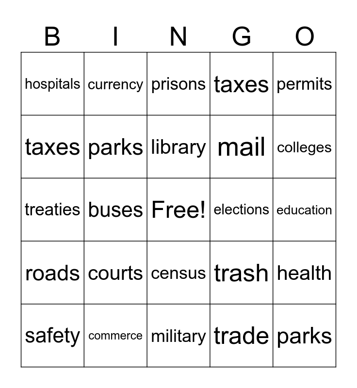 This bingo card has a free space and 36 words: police, fire, schools, parks, trash, roads, library, zoning, permits, water, buses, taxes, highways, elections, colleges, hospitals, licenses, courts, parks, prisons, education, health, commerce, safety, military, currency, treaties, immigration, mail, taxes, patents, veterans, trade, census, space and justice.