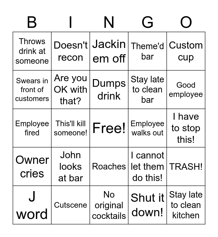 This bingo card has a free space and 28 words: TRASH!, Make a decision, Stay late to clean bar, Shut it down!, Swears in front of customers, Jackin em off, Doesn't recon, Owner cries, Employee walks out, J word, Employee fired, Theme'd bar, Cutscene, No original cocktails, Good employee, No POS, John looks at bar, Are you OK with that?, Dumps drink, Roaches, Throws drink at someone, A fight, Stay late to clean kitchen, This'll kill someone!, I have to stop this!, I cannot let them do this!, Custom cup and Mentions they're a vet.