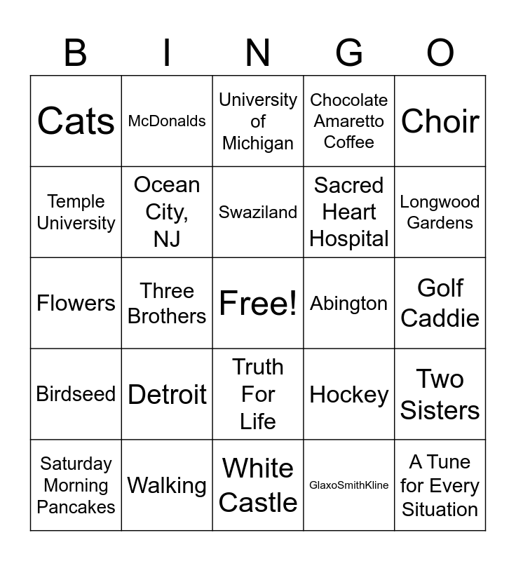 This bingo card has a free space and 24 words: Detroit, Walking, Swaziland, Saturday Morning Pancakes, Choir, Cats, Temple University, McDonalds, Abington, Truth For Life, Sacred Heart Hospital, Flowers, Hockey, Two Sisters, Ocean City, NJ, GlaxoSmithKline, Golf Caddie, University of Michigan, Longwood Gardens, Three Brothers, A Tune for Every Situation, Birdseed, Chocolate Amaretto Coffee and White Castle.