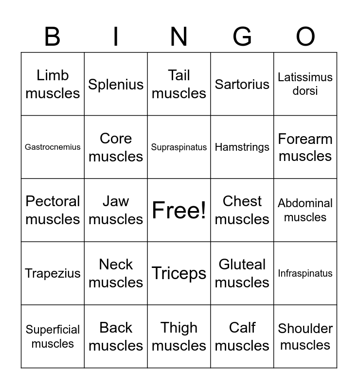 This bingo card has a free space and 29 words: Superficial muscles, Deep muscles, Jaw muscles, Facial muscles, Limb muscles, Tail muscles, Core muscles, Neck muscles, Chest muscles, Back muscles, Abdominal muscles, Shoulder muscles, Thigh muscles, Calf muscles, Forearm muscles, Biceps, Triceps, Trapezius, Latissimus dorsi, Pectoral muscles, Gluteal muscles, Quadriceps, Hamstrings, Gastrocnemius, Sartorius, Splenius, Infraspinatus, Supraspinatus and Subscapularis.