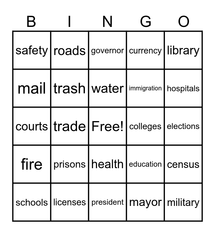 This bingo card has a free space and 34 words: parks, mayor, council, police, fire, trash, library, schools, roads, buses, water, governor, legislature, highways, colleges, hospitals, licenses, courts, prisons, education, health, commerce, safety, elections, president, military, currency, treaties, immigration, mail, taxes, trade, census and space.