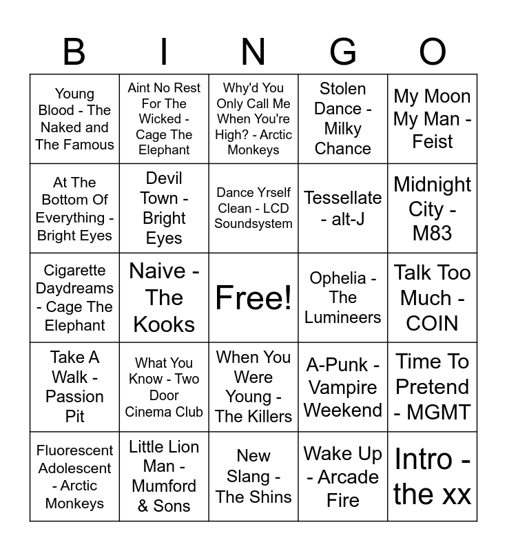 This bingo card has a free space and 42 words: 1901 - Phoenix, Dance Yrself Clean - LCD Soundsystem, Tongue Tied - Grouplove, What You Know - Two Door Cinema Club, Wake Up - Arcade Fire, Time To Pretend - MGMT, Intro - the xx, Sweater Weather - The Neighbourhood, Why'd You Only Call Me When You're High? - Arctic Monkeys, When You Were Young - The Killers, Talk Too Much - COIN, Midnight City - M83, Naive - The Kooks, My Moon My Man - Feist, Last Nite - The Strokes, A-Punk - Vampire Weekend, The Less I Know The Better - Tame Impala, Cigarette Daydreams - Cage The Elephant, In One Ear - Cage The Elephant, Aint No Rest For The Wicked - Cage The Elephant, At The Bottom Of Everything - Bright Eyes, Cough Syrup - Young The Giant, My Type - Saint Model, Young Blood - The Naked and The Famous, Hard Times - Paramore, Breezeblocks - alt-J, Tessellate - alt-J, Feels Like We Only Go Backwards - Tame Impala, I Wanna Be Yours - Arctic Monkeys, Heads Will Roll (A-Trak Remix), Lisztomania - Phoenix, Take A Walk - Passion Pit, Devil Town - Bright Eyes, New Slang - The Shins, Girl Inform Me - The Shins, Fluorescent Adolescent - Arctic Monkeys, Little Lion Man - Mumford & Sons, Ophelia - The Lumineers, Little Talks - Of Monsters And Men, Mykonos - Fleet Foxes, Stolen Dance - Milky Chance and He Doesn't Know Why - Fleet Foxes.