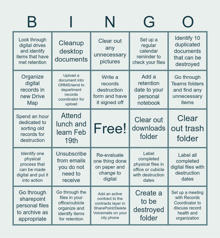 This bingo card has a free space and 24 words: Unsubscribe from emails you do not need to receive, Go through the files in your office/cubicle organize and identify items for retention, Write a records destruction form and have it signed off, Go through sharepoint personal files to archive as appropriate, Identify 10 duplicated documents that can be destroyed, Look through digital drives and identify items that have met retention, Organize digital records in new Drive Map, Cleanup desktop documents, Clear out downloads folder, Re-evaluate one thing done on paper and change to digital, Add a retention date to your personal notebook, Spend an hour dedicated to sorting old records for destruction, Label completed physical files in office or cubicle with destruction dates, Label all completed digital files with destruction dates, Upload a document into ORMS/send to department records coordinator for upload, Create a to be destroyed folder, Clear out trash folder, Clear out any unnecessary pictures, Go through Teams folders and find any unnecessary items, Attend lunch and learn Feb 19th, Set up a meeting with Records Coordinator to discuss record health and organization, Identify one physical process that can be made digital and put it into action, Set up a regular calendar reminder to check your files and Add an active contract to the contracts layer in SharePoint/Delete Voicemails on your city phone.