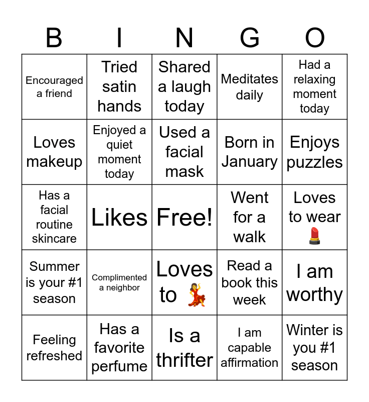 This bingo card has a free space and 24 words: Feeling refreshed, Complimented a neighbor, Used a facial mask, I am capable affirmation, Had a relaxing moment today, Encouraged a friend, Tried satin hands, Shared a laugh today, Went for a walk, Loves to wear 💄, Has a facial routine skincare, Enjoyed a quiet moment today, Read a book this week, I am worthy, Loves makeup, Has a favorite perfume, Is a thrifter, Meditates daily, Enjoys puzzles, Summer is your #1 season, Likes, Loves to 💃, Born in January and Winter is you #1 season.