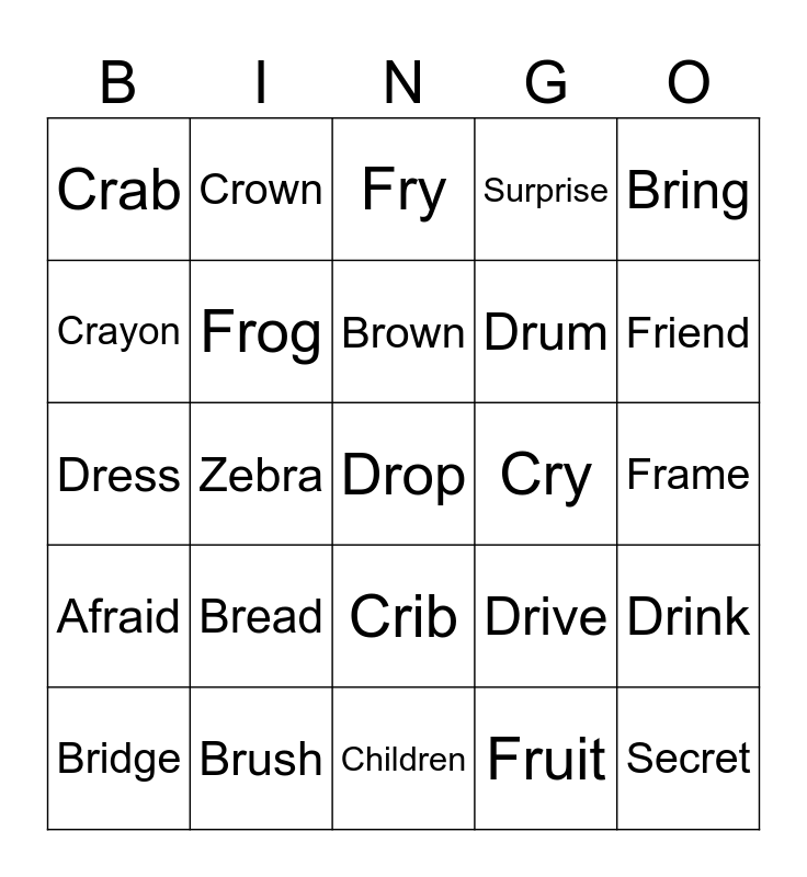 This bingo card has a free space and 24 words: Bread, Brush, Brown, Bridge, Bring, Crab, Crayon, Crown, Cry, Crib, Drum, Dress, Drive, Drink, Frog, Fruit, Frame, Fry, Friend, Zebra, Secret, Afraid, Surprise and Children.