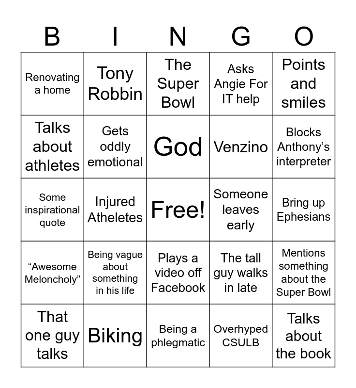 This bingo card has a free space and 28 words: Mentions something about the Super Bowl, “Make Sense?”, Venzino, Overhyped CSULB, Talks about athletes, The Super Bowl, Tony Robbin, “Awesome Meloncholy”, Someone leaves early, That one guy talks, Some inspirational quote, Asks Angie For IT help, Biking, Being a phlegmatic, Blocks Anthony’s interpreter, Talks about his small group, Being vague about something in his life, Gets oddly emotional, God, Plays a video off Facebook, Renovating a home, How healthy he is, Talks about the book, Injured Atheletes, Bring up Ephesians, The tall guy walks in late, Points and smiles and Talks about his wife.
