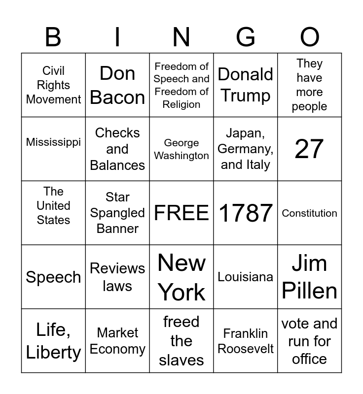 This bingo card has a free space and 29 words: Life, Liberty, July 4, 1776, Star Spangled Banner, Deb Fischer, Civil Rights Movement, Freedom of Speech and Freedom of Religion, Checks and Balances, Reviews laws, 1787, Market Economy, Constitution, vote and run for office, freed the slaves, Franklin Roosevelt, 27, The Civil War, New York, Speech, They have more people, The United States, Louisiana, Any citizen can vote, Japan, Germany, and Italy, Mississippi, Donald Trump, Don Bacon, Jim Pillen, George Washington and The bill of Rights.