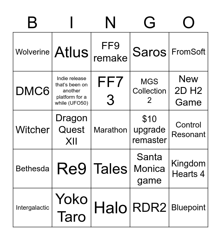 This bingo card has a free space and 24 words: Re9, Yoko Taro, FF7 3, Intergalactic, FromSoft, Wolverine, DMC6, Atlus, $10 upgrade remaster, Tales, MGS Collection 2, Witcher, Santa Monica game, Kingdom Hearts 4, Indie release that’s been on another platform for a while (UFO50), RDR2, Control Resonant, FF9 remake, New 2D H2 Game, Dragon Quest XII, Bluepoint, Bethesda, Saros and Halo.
