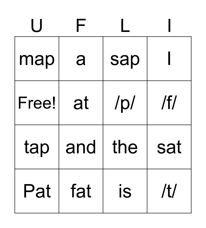 This bingo card has 16 words: fat, sat, sap, map, tap, a, the, is, Free!, at, Pat, I, and, /f/, /p/ and /t/.