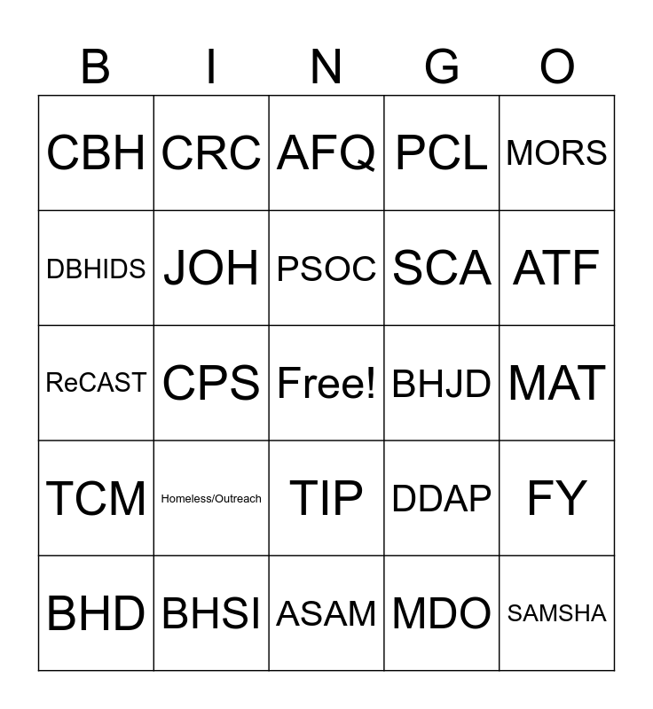This bingo card has a free space and 24 words: Homeless/Outreach, BHSI, PSOC, BHD, MORS, CBH, DBHIDS, CRC, BHJD, TIP, SCA, ReCAST, DDAP, FY, JOH, MDO, MAT, AFQ, ATF, CPS, SAMSHA, TCM, PCL and ASAM.