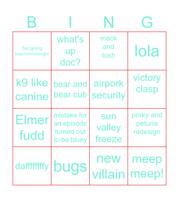 This bingo card has 16 words: bugs, porky and petuna redesign, mack and tosh, Taz going blarrrrrrrrrrrrrgh!, Elmer fudd, what's up doc?, sun valley freeze, new villain, k9 like canine, bear and bear cub, daffffffffy, lola, mistake for an episode turned out to be bluey, victory clasp, airpork security and meep meep!.