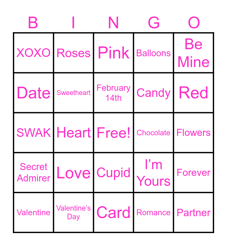 This bingo card has a free space and 24 words: Love, Valentine’s Day, February 14th, Valentine, Be Mine, XOXO, Date, Roses, Chocolate, Cupid, Candy, SWAK, I’m Yours, Forever, Sweetheart, Romance, Flowers, Pink, Red, Heart, Partner, Secret Admirer, Balloons and Card.
