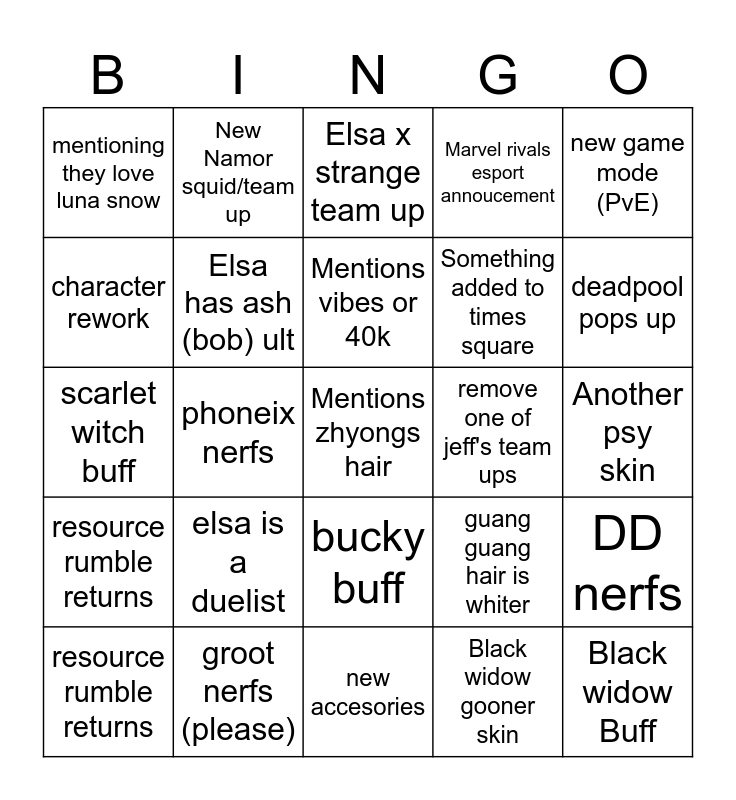 This bingo card has a free space and 24 words: elsa is a duelist, groot nerfs (please), Mentions vibes or 40k, resource rumble returns, new game mode (PvE), mentioning they love luna snow, character rework, New Namor squid/team up, remove one of jeff's team ups, bucky buff, Something added to times square, scarlet witch buff, guang guang hair is whiter, DD nerfs, Elsa has ash (bob) ult, Black widow gooner skin, Another psy skin, Elsa x strange team up, deadpool pops up, phoneix nerfs, Black widow Buff, resource rumble returns, Marvel rivals esport annoucement and new accesories.