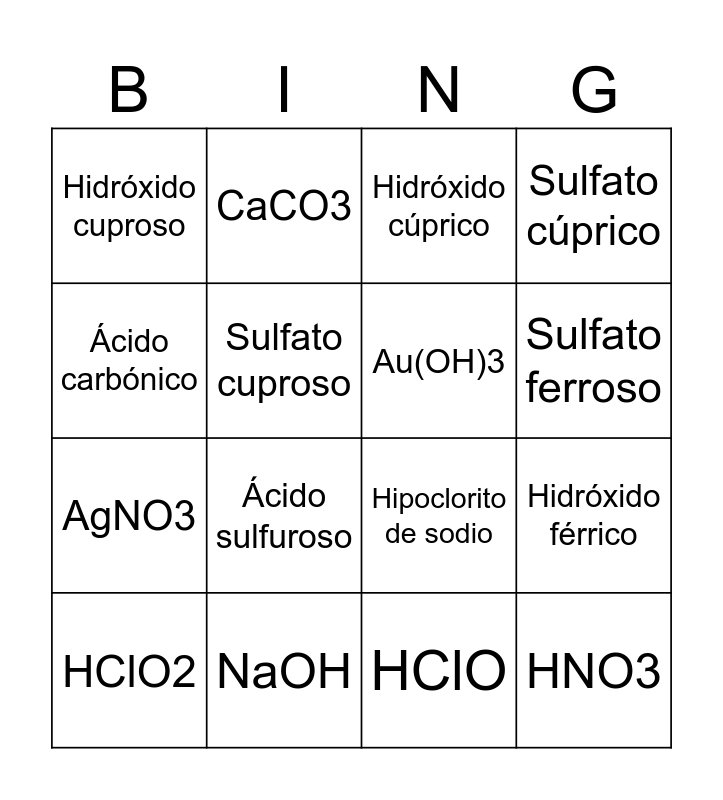 This bingo card has 30 words: Al(OH)3, Hidróxido ferroso, Hidróxido férrico, Dihidróxido de bario, Hidróxido cuproso, Hidróxido cúprico, Au(OH)3, Hidróxido de zinc, NaOH, Ca(OH)2, HClO, HClO2, HClO3, HClO4, Ácido sulfuroso, Ácido sulfúrico, HNO2, HNO3, Ácido carbonoso, Ácido carbónico, Hipoclorito de sodio, Na2SO4, CaCO3, AgNO3, Sulfato cuproso, Sulfato cúprico, NaNO2, Carbonato de zinc, Sulfato ferroso and Sulfato férrico.