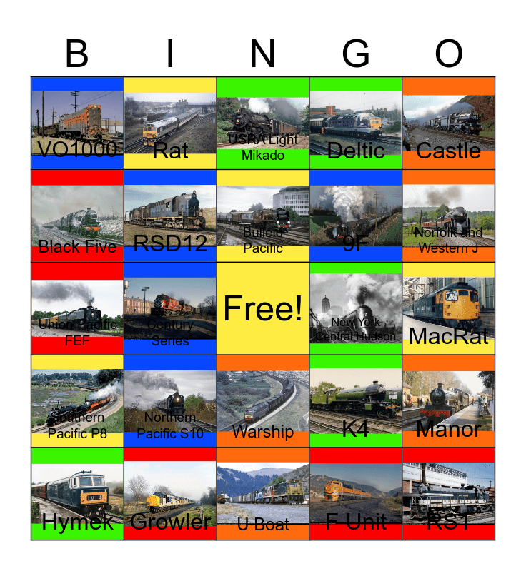 This bingo card has 24 images, a free space and 24 words: Northern Pacific S10, Growler, Bulleid Pacific, Hymek, Castle, VO1000, Black Five, Rat, New York Central Hudson, Warship, 9F, Union Pacific FEF, K4, Manor, RSD12, F Unit, MacRat, USRA Light Mikado, Norfolk and Western J, Century Series, RS1, Southern Pacific P8, Deltic and U Boat.