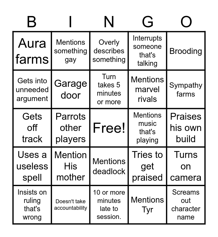 This bingo card has a free space and 24 words: Mention His mother, Doesn't take accountability, Turn takes 5 minutes or more, Insists on ruling that's wrong, Brooding, Aura farms, Gets into unneeded argument, Mentions something gay, Mentions music that's playing, Mentions deadlock, Mentions marvel rivals, Gets off track, Tries to get praised, Turns on camera, Garage door, Mentions Tyr, Praises his own build, Overly describes something, Sympathy farms, Parrots other players, Screams out character name, Uses a useless spell, Interrupts someone that's talking and 10 or more minutes late to session..