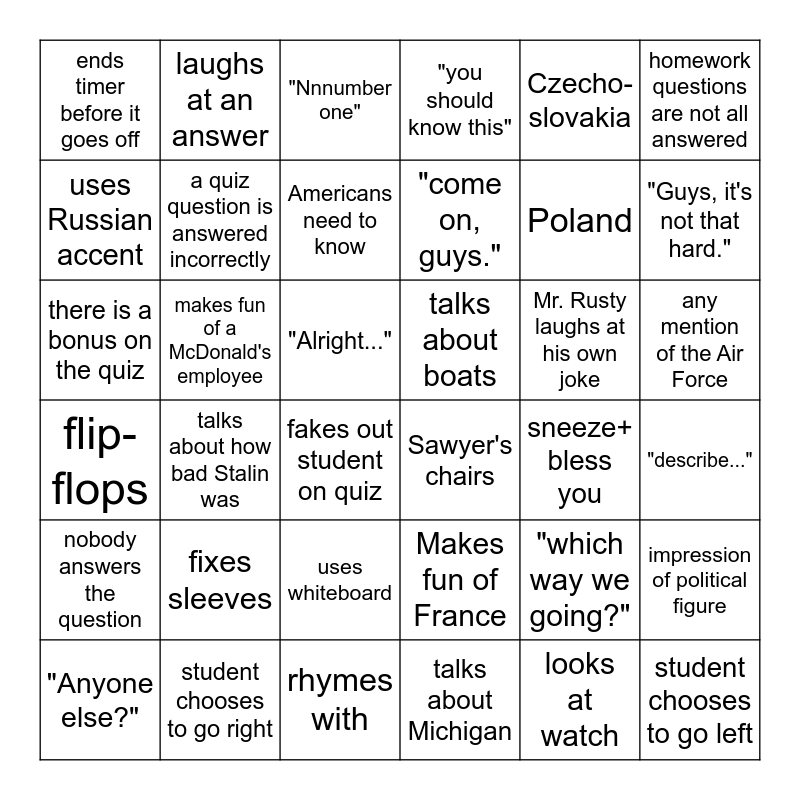 This bingo card has 41 words: talks about Michigan, Poland, somebody doesn't have the answer, uses Russian accent, Sawyer's chairs, any mention of the Air Force, a quiz question is answered incorrectly, movie reference, Czecho-slovakia, talks about boats, "Guys, it's not that hard.", "you should know this", there is a bonus on the quiz, "Alright...", makes fun of a McDonald's employee, Mr. Rusty laughs at his own joke, "Anyone else?", ends timer before it goes off, looks at watch, "Nnnumber one", talks about how bad Stalin was, nobody answers the question, sneeze+ bless you, Americans need to know, student chooses to go left, "which way we going?", "describe...", story for longer than two minutes, "come on, guys.", fixes sleeves, talks about a country that he has been to, laughs at an answer, fakes out student on quiz, student chooses to go right, flip-flops, homework questions are not all answered, uses whiteboard, impression of political figure, rhymes with, Makes fun of France and mentions a book.