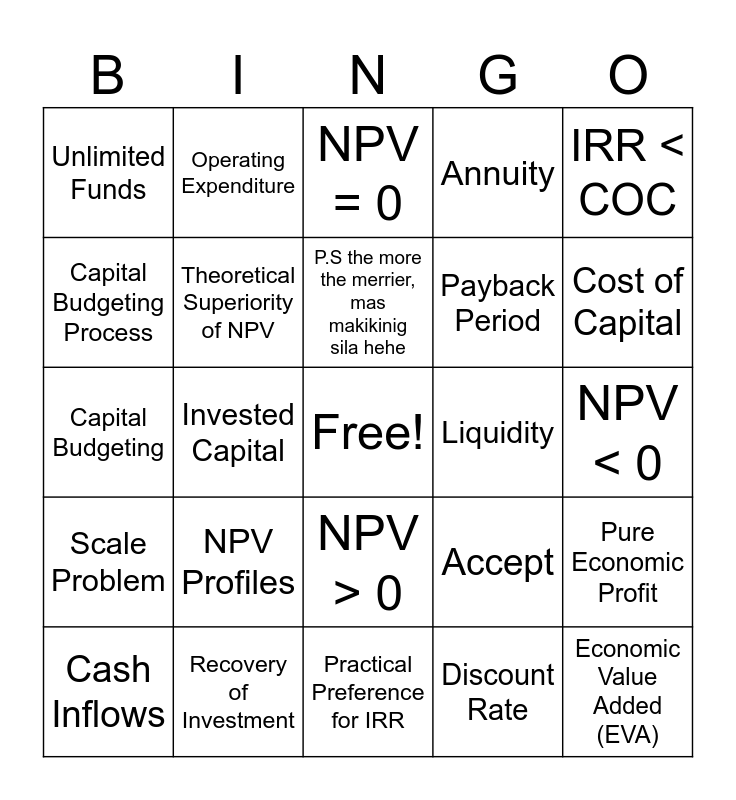 This bingo card has a free space and 42 words: TERMS [PLEASE INPUT AT LEAST 5 CONCEPTS FROM YOUR REPORT], P.S the more the merrier, mas makikinig sila hehe, Internal Rate of Return (IRR), NPV Profiles, Discount Rate, Pure Economic Profit, Economic Value Added (EVA), Profitability Index (PI), NPV = 0, NPV > 0, NPV < 0, Cost of Capital, Invested Capital, IRR < COC, IRR > COC, Accept, Reject, Capital Budgeting, Capital Expenditure, Operating Expenditure, Capital Budgeting Process, Independent Projects, Mutually Exclusive Projects, Unlimited Funds, Capital Rationing, Payback Analysis, Payback Period, Net Present Value, Internal Rate of Return, Reinvestment Assumption, Timing of Cash Flows, Scale Problem, Theoretical Superiority of NPV, Practical Preference for IRR, Initial Investment, Cash Inflows, Recovery of Investment, Liquidity, Risk Exposure, Annual Cash Inflow, Annuity and Product life cycle.