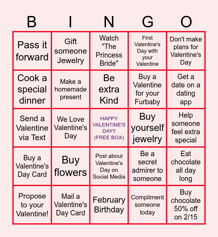 This bingo card has a free space and 31 words: February Birthday, Don't forget to make dinner reservations, We Love Valentine's Day, Get Married on Valentine's Day, Pass it forward, Watch "The Princess Bride", Make a homemade present, Be a secret admirer to someone, Buy yourself jewelry, Compliment someone today, Help someone feel extra special, Buy chocolate 50% off on 2/15, Watch a romantic comedy, Go on a Blind Date, Get a date on a dating app, Work in a restaurant on Valentine's Day, Eat chocolate all day long, Buy flowers, Buy a Valentine's Day Card, Post about Valentine's Day on Social Media, Don't make plans for Valentine's Day, Eat Valentine's Day treats, Propose to your Valentine!, Gift someone Jewelry, Buy a Valentine for your Furbaby, Cook a special dinner, First Valentine's Day with your Valentine, Send a Valentine via Text, Mail a Valentine's Day Card, Be extra Kind and Love Extra.