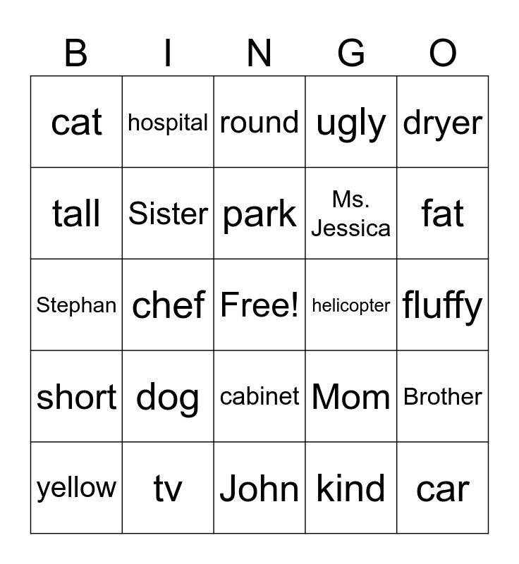 This bingo card has a free space and 25 words: dog, John, park, yellow, dryer, cat, tall, hospital, helicopter, cabinet, Ms. Jessica, Stephan, Mom, Brother, Sister, grandma, fluffy, round, fat, chef, car, tv, short, ugly and kind.