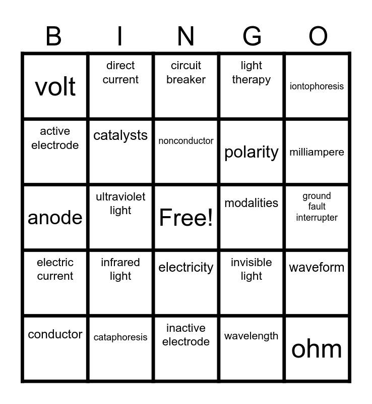 This bingo card has a free space and 24 words: infrared light, cataphoresis, nonconductor, conductor, iontophoresis, volt, active electrode, direct current, modalities, electricity, polarity, anode, invisible light, waveform, catalysts, wavelength, ground fault interrupter, circuit breaker, milliampere, ultraviolet light, ohm, electric current, light therapy and inactive electrode.