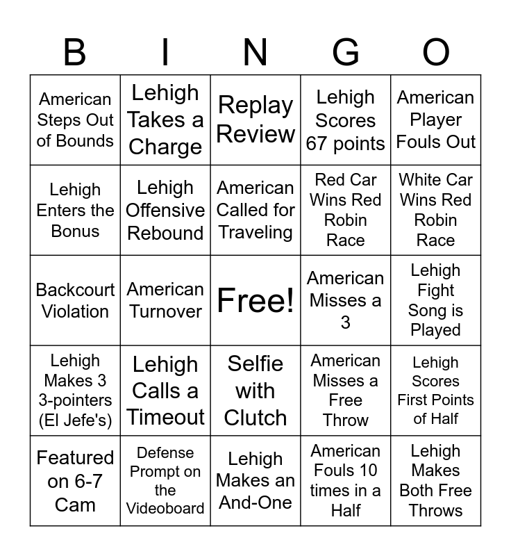 This bingo card has a free space and 46 words: Lehigh Wins Tip-Off, Lehigh Makes Both Free Throws, Lehigh Makes 3-Pointer, Lehigh Makes an And-One, Lehigh Calls a Timeout, Lehigh Dunk, Lehigh Takes a Charge, Lehigh Steal, Lehigh Enters the Bonus, Lehigh Blocks a Shot, Lehigh Offensive Rebound, Lehigh Scores 67 points, Lehigh Scores First Points of Half, American Misses a Free Throw, American Air Ball, American Shot Clock Violation, American Called for Traveling, American Misses a 3, American Calls a Timeout, American Player Fouls Out, American Turnover, American Fouls 10 times in a Half, American Steps Out of Bounds, Red Car Wins Red Robin Race, Yellow Car Wins Red Robin Race, White Car Wins Red Robin Race, Featured on 6-7 Cam, Featured on Tube Man Cam, Selfie with Clutch, Lehigh Makes 3 3-pointers (El Jefe's), American Misses Both Free Throws in the Second Half (Chick-Fil-A), Compete in an On-Court Promo, Make a Sign to Cheer on Lehigh, Your Row Wins the Red Robin Race, Wearing Brown & White, Defense Prompt on the Videoboard, Lehigh Fight Song is Played, Let's Go Lehigh Prompt on the Videoboard, Make Your Own Medal in the Lobby, Dance team performs, Clutch featured on the videoboard, Replay Review, Backcourt Violation, 3-Second Violation, 5-Second Violation and Held Ball.