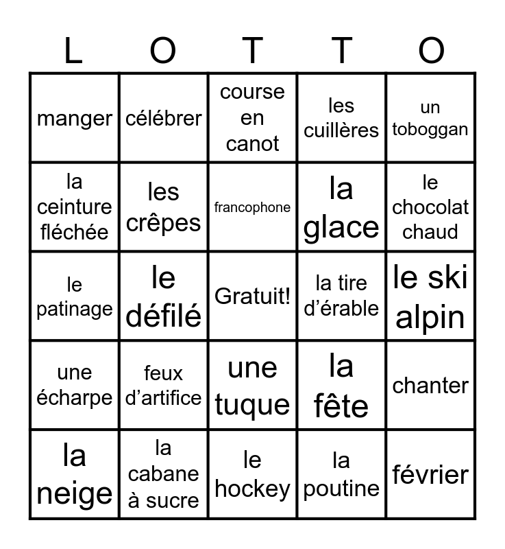 This bingo card has a free space and 44 words: hiver, février, Bonhomme Carnaval, la neige, la sculpture de glace, la poutine, course en canot, palais de glace, un toboggan, la cabane à sucre, les cuillères, la tire d’érable, une tuque, feux d’artifice, les patins, le hockey, le curling, le patinage, la Ville de Québec, le chocolat chaud, célébrer, un manteau, les mitaines, manger, le ski nordique, le ski alpin, la musique, le froid, la fête, une écharpe, glisser, chanter, danser, le spectacle, le défilé, des bottes, un flocon de neige, une boule de neige, francophone, la ceinture fléchée, la glace, la fleuve Saint-Laurent, les crêpes and une queue de castor.
