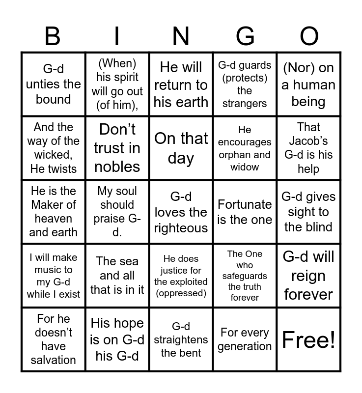 This bingo card has 33 words: Free!, Praise G-d!, My soul should praise G-d., I will praise G-d while I live, I will make music to my G-d while I exist, Don’t trust in nobles, (Nor) on a human being, For he doesn’t have salvation, (When) his spirit will go out (of him),, He will return to his earth, On that day, He will return to his earth, On that day, His plans perish (are lost)., Fortunate is the one, That Jacob’s G-d is his help, His hope is on G-d his G-d, He is the Maker of heaven and earth, The sea and all that is in it, The One who safeguards the truth forever, He does justice for the exploited (oppressed), He gives bread to the hungry, G-d unties the bound, G-d gives sight to the blind, G-d straightens the bent, G-d loves the righteous, G-d guards (protects) the strangers, He encourages orphan and widow, And the way of the wicked, He twists, G-d will reign forever, Your G-d, Zion, For every generation and Praise G-d!.