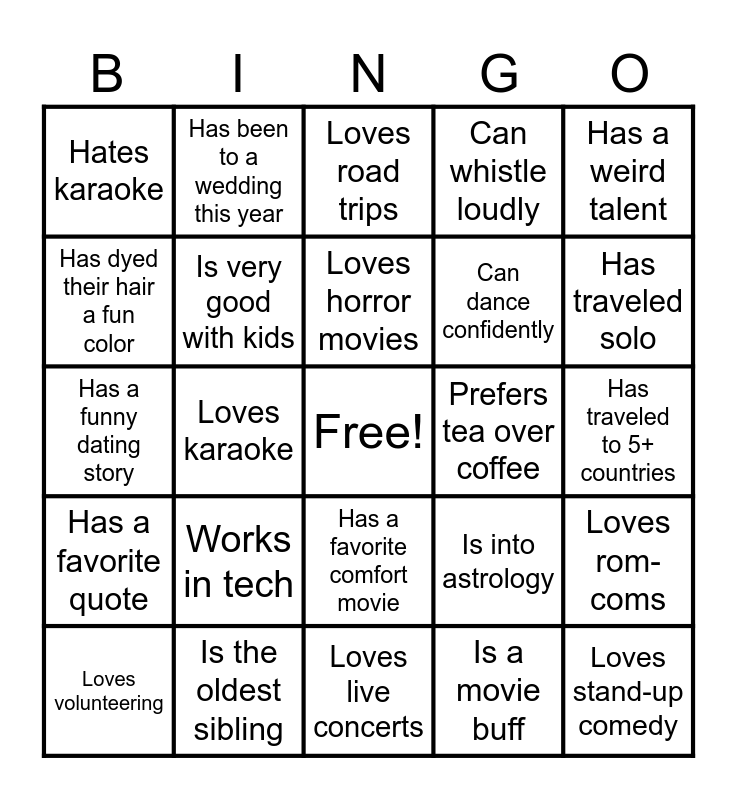 This bingo card has a free space and 100 words: Knows a second language, Has lived in another country, Has traveled to 5+ countries, Can cook a signature dish, Plays a musical instrument, Has run a marathon (or half), Is a morning person, Is a night owl, Loves spicy food, Hates pineapple on pizza, Has a dog, Has a cat, Is an only child, Is the oldest sibling, Is the youngest sibling, Has met a celebrity, Can dance confidently, Is left-handed, Has a visible tattoo, Has gone skydiving, Has gone scuba diving, Loves hiking, Has a plant they’re proud of, Can make a great cocktail, Prefers coffee over tea, Prefers tea over coffee, Has a weird talent, Is into astrology, Is into board games, Is a gamer, Loves karaoke, Hates karaoke, Has been on a reality TV show, Has binge-watched an entire series in a weekend, Is a movie buff, Loves horror movies, Loves rom-coms, Can quote The Office (or similar), Is a foodie, Is vegetarian or vegan, Has food allergies, Can bake really well, Has a funny dating story, Has tried online dating apps, Has traveled solo, Loves road trips, Has a favorite podcast, Is really into music, Has been to a music festival, Loves live concerts, Has broken a bone, Has lived in more than 3 cities, Speaks with an accent, Loves museums, Loves the beach more than mountains, Loves mountains more than the beach, Is really into fitness, Does yoga or Pilates, Plays a team sport, Can whistle loudly, Has a bucket list item planned, Loves trivia nights, Is competitive about games, Is very chill about games, Has a favorite conspiracy theory, Loves true crime, Is afraid of spiders, Is afraid of flying, Is always early, Is always late, Has a cool job title, Works in tech, Works in a creative field, Works in healthcare, Works remotely, Loves thrift shopping, Loves fashion, Has dyed their hair a fun color, Has a piercing (other than ears), Loves photography, Can do impressions, Loves stand-up comedy, Is into astrology and psychology, Has a favorite comfort movie, Loves puzzles or escape rooms, Has been to a wedding this year, Loves brunch, Is a big planner, Is very spontaneous, Has a favorite quote, Loves journaling, Is learning a new skill, Has a side hustle, Loves volunteering, Is very good with kids, Is great with animals, Has a strong opinion about desserts, Loves traveling for food, Has a dream vacation destination and Would actually win bingo tonight 😉.