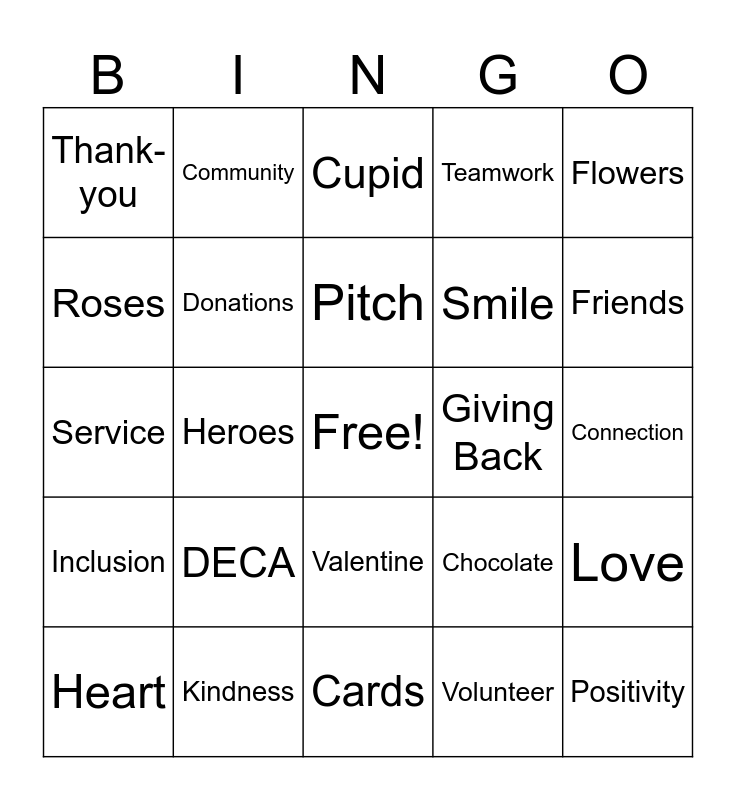 This bingo card has a free space and 24 words: DECA, Kindness, Pitch, Heart, Flowers, Thank-you, Roses, Community, Giving Back, Valentine, Smile, Service, Chocolate, Love, Donations, Volunteer, Connection, Cupid, Friends, Heroes, Positivity, Inclusion, Teamwork and Cards.