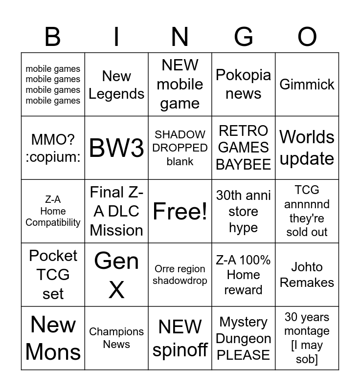 This bingo card has a free space and 24 words: Gen X, Champions News, SHADOW DROPPED blank, New Mons, Gimmick, mobile games mobile games mobile games mobile games, MMO? :copium:, New Legends, 30th anni store hype, Orre region shadowdrop, RETRO GAMES BAYBEE, Z-A Home Compatibility, Z-A 100% Home reward, Johto Remakes, BW3, Mystery Dungeon PLEASE, TCG annnnnd they're sold out, NEW mobile game, Worlds update, Final Z-A DLC Mission, 30 years montage [I may sob], Pocket TCG set, Pokopia news and NEW spinoff.