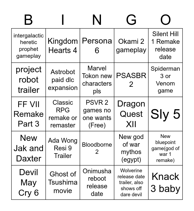 This bingo card has a free space and 24 words: Devil May Cry 6, Ada Wong Resi 9 Trailer, Marvel Tokon new characters pls, Wolverine release date trailer, also shows off dare devil, Silent Hill 1 Remake release date, intergalactic heretic prophet gameplay, Kingdom Hearts 4, Persona 6, Dragon Quest XII, Sly 5, FF VII Remake Part 3, Astrobot paid dlc expansion, New god of war mythos (egypt), New bluepoint game(god of war 1 remake), project robot trailer, Ghost of Tsushima movie, Onimusha reboot release date, Okami 2 gameplay, Spiderman 3 or Venom game, New Jak and Daxter, Classic RPG remake or remaster, Bloodborne 2, PSASBR 2 and Knack 3 baby.