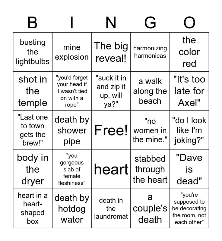 This bingo card has a free space and 27 words: stabbed through the heart, "Beware what you make fun of, little asshole", a walk along the beach, death in the laundromat, shot in the temple, The big reveal!, mine explosion, body in the dryer, "no women in the mine.", "Dave is dead", "Last one to town gets the brew!", harmonizing harmonicas, heart in a heart-shaped box, death by hotdog water, "It's too late for Axel", "the oldest part of the mine", "you'd forget your head if it wasn't tied on with a rope", "suck it in and zip it up, will ya?", "you gorgeous slab of female fleshiness", busting the lightbulbs, "do I look like I'm joking?", a couple's death, death by shower pipe, "you're supposed to be decorating the room, not each other", heart, the color red and upside down heart.