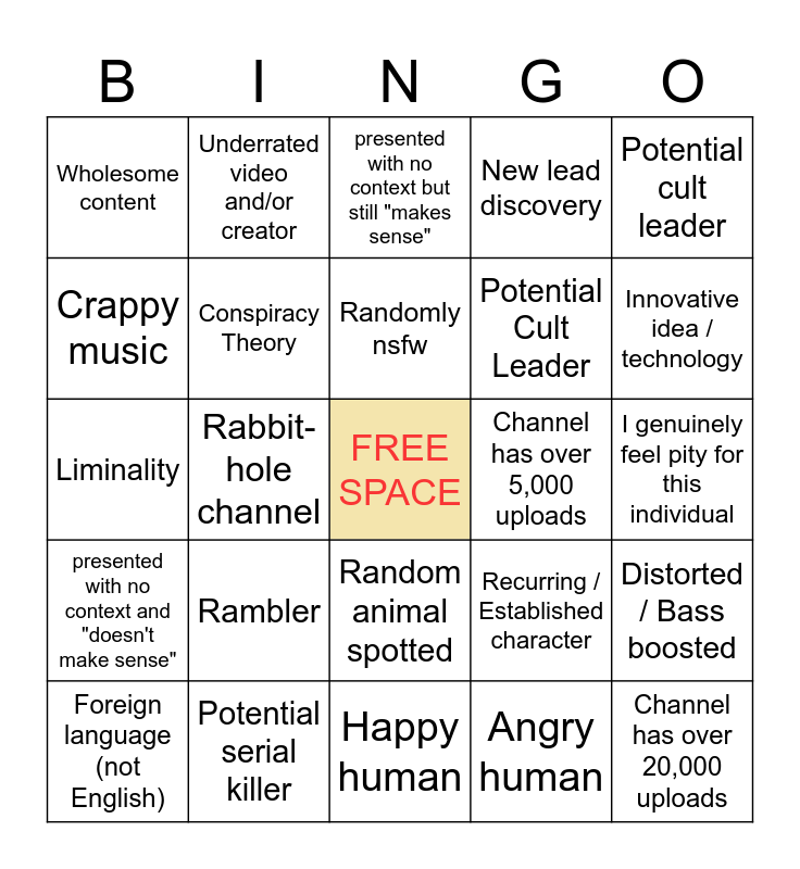 This bingo card has a free space and 24 words: Foreign language (not English), Rambler, Randomly nsfw, Angry human, Potential cult leader, Wholesome content, Underrated video and/or creator, presented with no context but still "makes sense", Channel has over 5,000 uploads, I genuinely feel pity for this individual, Liminality, Conspiracy Theory, Recurring / Established character, Distorted / Bass boosted, Crappy music, Potential serial killer, Happy human, New lead discovery, Innovative idea / technology, presented with no context and "doesn't make sense", Rabbit-hole channel, Random animal spotted, Potential Cult Leader and Channel has over 20,000 uploads.