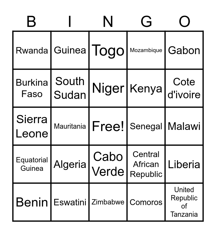 This bingo card has a free space and 24 words: Algeria, Eswatini, Niger, Benin, Gabon, Rwanda, Burkina Faso, Guinea, Senegal, Cabo Verde, Kenya, Sierra Leone, Central African Republic, Liberia, South Sudan, Comoros, Malawi, Togo, Cote d'ivoire, Mauritania, United Republic of Tanzania, Equatorial Guinea, Mozambique and Zimbabwe.