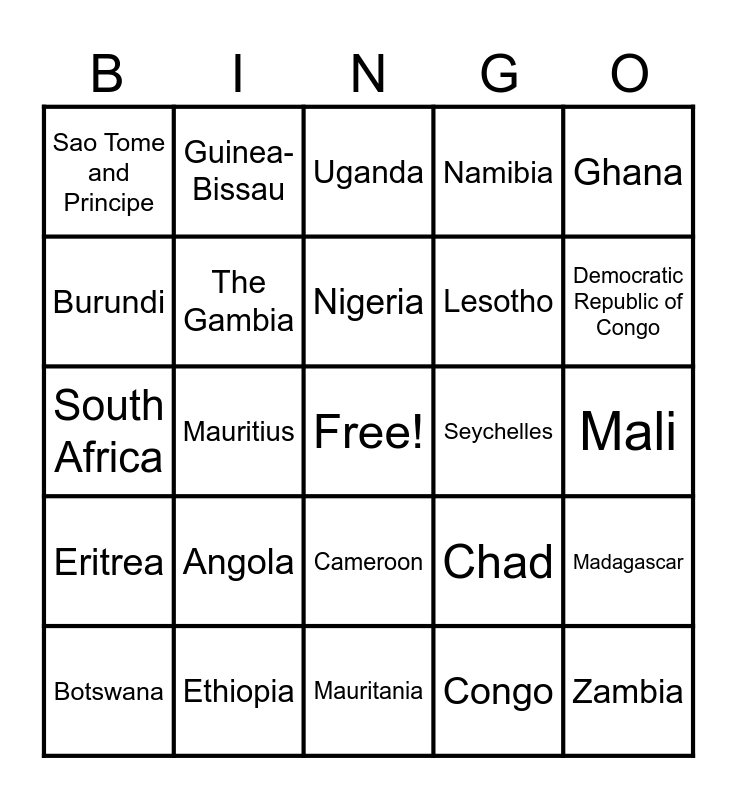 This bingo card has a free space and 24 words: Angola, Ethiopia, Nigeria, Botswana, Ghana, Sao Tome and Principe, Burundi, Guinea-Bissau, Seychelles, Cameroon, Lesotho, South Africa, Chad, Madagascar, The Gambia, Congo, Mali, Uganda, Democratic Republic of Congo, Mauritius, Zambia, Eritrea, Namibia and Mauritania.