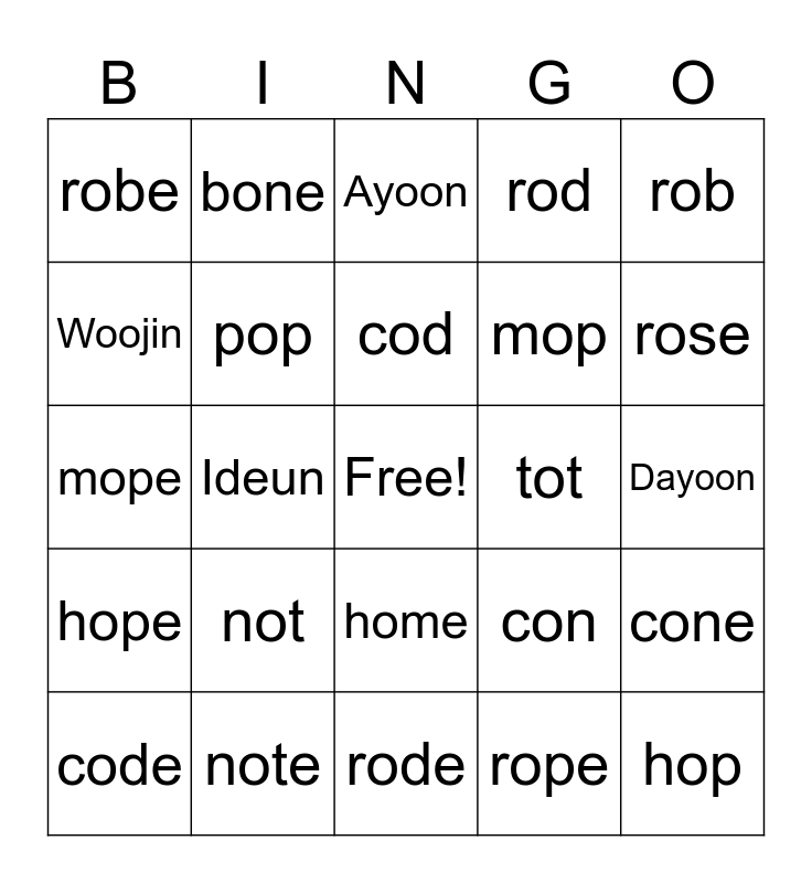 This bingo card has a free space and 24 words: not, note, cod, code, rob, robe, Woojin, bone, tot, home, mop, mope, con, cone, pop, rope, Dayoon, Ayoon, rose, Ideun, hop, hope, rod and rode.