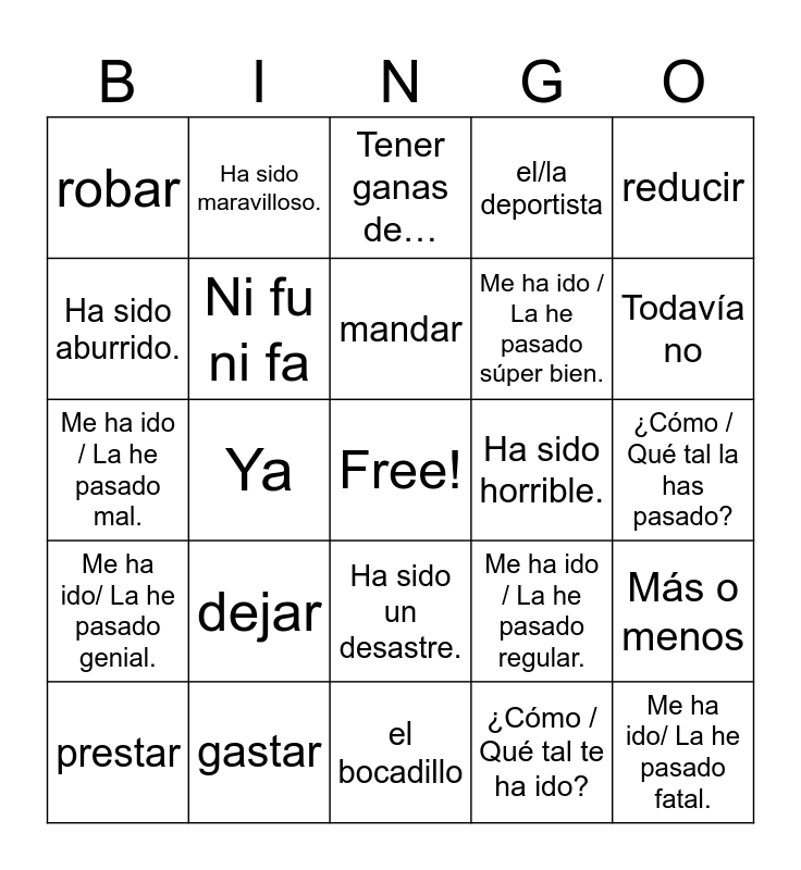 This bingo card has a free space and 24 words: dejar, gastar, mandar, prestar, reducir, robar, Ha sido aburrido., Ha sido maravilloso., Ha sido horrible., Ha sido un desastre., Me ha ido / La he pasado súper bien., Me ha ido / La he pasado mal., Me ha ido / La he pasado regular., Más o menos, Ni fu ni fa, ¿Cómo / Qué tal te ha ido?, ¿Cómo / Qué tal la has pasado?, Tener ganas de…, Todavía no, Ya, Me ha ido/ La he pasado fatal., Me ha ido/ La he pasado genial., el/la deportista and el bocadillo.