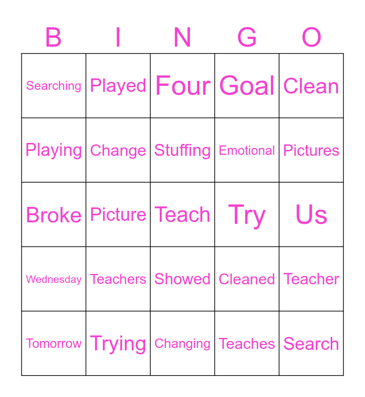 This bingo card has 42 words: Stuff, Stuffing, Stuffed, Teachers, Teaches, Teacher, Teach, Teaching, Four, Showed, Us, Pictures, Picture, Clean, Cleaning, Cleaned, Break, Broke, Breaking, Played, Playing, Player, Search, Searching, Searched, Emotion, Emotional, Emotions, Every, Single, Tuesday, Wednesday, Change, Changing, Changed, Tomorrow, Trying, Try, Tried, Super, Goal and Medal.