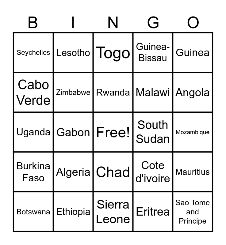 This bingo card has a free space and 24 words: Algeria, Ethiopia, Rwanda, Botswana, Guinea, Seychelles, Cabo Verde, Lesotho, South Sudan, Chad, Malawi, Uganda, Cote d'ivoire, Mauritius, Zimbabwe, Eritrea, Mozambique, Togo, Angola, Gabon, Sao Tome and Principe, Burkina Faso, Guinea-Bissau and Sierra Leone.