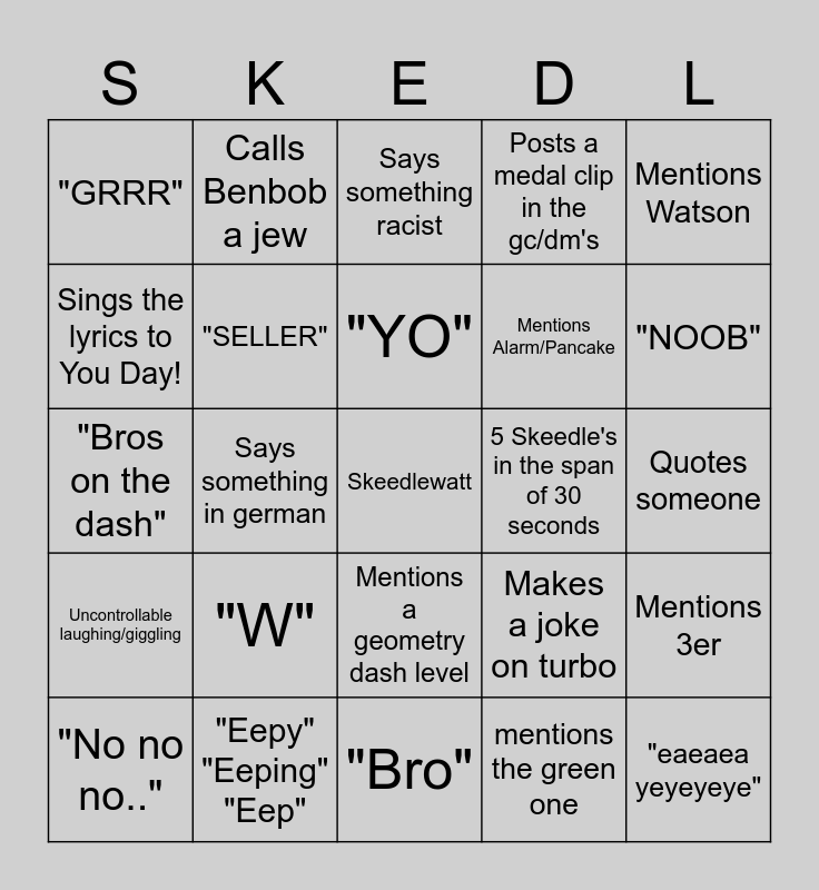 This bingo card has 29 words: "No no no..", Says something completely random, Skeedlewatt, mentions the green one, Mentions Watson, Sings the lyrics to You Day!, Calls Benbob a jew, "Bro", 5 Skeedle's in the span of 30 seconds, "eaeaea yeyeyeye", "Bros on the dash", "SELLER", Random Scream, Makes a joke on turbo, Quotes someone, Says something unrelated to the topic at hand, Says something in german, Mentions a geometry dash level, Posts a medal clip in the gc/dm's, Mentions 3er, Uncontrollable laughing/giggling, "Eepy" "Eeping" "Eep", "YO", Mentions Alarm/Pancake, "NOOB", "GRRR", "W", Says something racist and Says something related to talking ben.