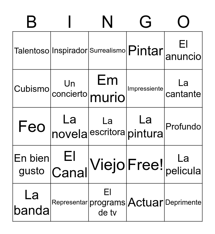 This bingo card has 25 words: El Canal, El programs de tv, Em murio, La banda, El anuncio, Talentoso, Cubismo, Inspirador, La pintura, Viejo, Impressiente, Feo, Free!, La pelicula, Un concierto, Deprimente, Profundo, Surrealismo, La cantante, La novela, La escritora, Representar, En bien gusto, Pintar and Actuar.