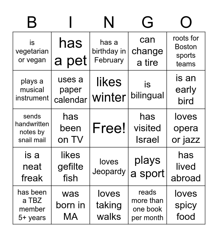 This bingo card has a free space and 24 words: likes gefilte fish, was born in MA, likes winter, has been a TBZ member 5+ years, roots for Boston sports teams, is vegetarian or vegan, plays a musical instrument, has a pet, has visited Israel, loves Jeopardy, is bilingual, sends handwritten notes by snail mail, plays a sport, has lived abroad, uses a paper calendar, reads more than one book per month, loves opera or jazz, has a birthday in February, is an early bird, has been on TV, loves spicy food, is a neat freak, can change a tire and loves taking walks.