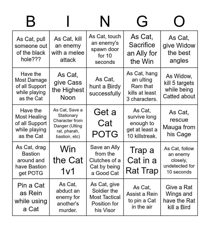 This bingo card has a free space and 29 words: Pin a Cat as Rein while using a Cat, As Cat, Deliver the Big Bomb, As Cat, Save a Stationary Character from Danger (Ulting rat, pharah, bastion, etc), Kill an Enemy with Env with Cat Ult, As Cat, pull someone out of the black hole???, As Cat, touch an enemy's spawn door for 10 seconds, As Cat, give Cass the Highest Noon, Win the Cat 1v1, As Cat, survive long enough to get at least a 10 killstreak., As Cat, abduct an enemy for another's murder., As Cat, rescue Mauga from his Cage, Give a Rat Wings and have the Rat kill a Bird, As Cat, give Soldier the Most Tactical Position for his Visor, As Cat, Assist a Rein to pin a Cat in the air, As Widow, kill 5 targets while being Catted about, Kill a Cat with a Sniper Rifle (Widowmaker), Save an Ally from the Clutches of a Cat by being a Good Cat, As Cat, drag Bastion around and have Bastion get POTG, As Cat, give Widow the best angles, Have the Most Healing of all Support while playing as the Cat, Trap a Cat in a Rat Trap, As Cat, assist Rein for the purpose of a HUGE SLAM (3 targets), As Cat, hang an ulting Ram that kills at least 3 characters., Have the Most Damage of all Support while playing as the Cat, As Cat, Sacrifice an Ally for the Win, As Cat, kill an enemy with a melee attack, As Cat, follow an enemy closely, undetected for 10 seconds, As Cat, hunt a Birdy successfully and As Cat, be a major contributor in a teamwipe.