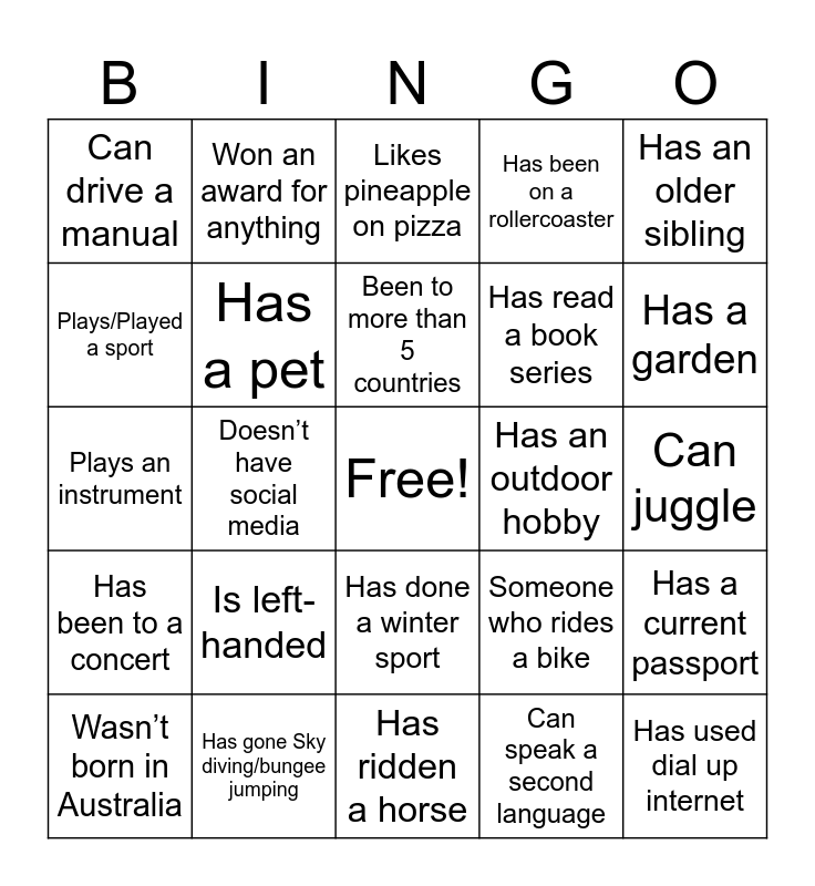 This bingo card has a free space and 24 words: Is left-handed, Has gone Sky diving/bungee jumping, Been to more than 5 countries, Wasn’t born in Australia, Has an older sibling, Can drive a manual, Plays/Played a sport, Won an award for anything, Has an outdoor hobby, Has done a winter sport, Has read a book series, Plays an instrument, Someone who rides a bike, Has a current passport, Has a pet, Can speak a second language, Can juggle, Likes pineapple on pizza, Has a garden, Doesn’t have social media, Has used dial up internet, Has been to a concert, Has been on a rollercoaster and Has ridden a horse.