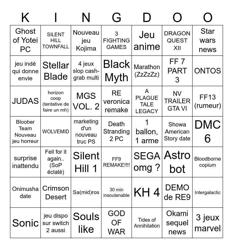 This bingo card has a free space and 48 words: KH 4, FF 7 PART 3, GOD OF WAR, WOLVEMID, MGS VOL. 2, DMC 6, SILENT HILL TOWNFALL, jeu dispo sur switch 2 aussi, DRAGON QUEST XII, FF9 REMAKE!!!!, Star wars news, 3 FIGHTING GAMES, NV TRAILER GTA VI, A PLAGUE TALE LEGACY, Onimusha date, Showa American Story date, jeu indé qui donne envie, ONTOS, DEMO de RE9, Jeu anime, Marathon (ZzZzZz), marketing d'un nouveau truc PS, Ghost of Yotei PC, Stellar Blade, Intergalactic, 4 jeux slop cash-grab multi, FF13 (rumeur), Sonic, RE veronica remake, horizon coop (tentative de faire un mh), Okami sequel news, 1 ballon, 1 arme, Bloodborne copium, Crimson Desert, Bloober Team Nouveau jeu horreur, SEGA omg ?, Astro bot, JUDAS, Silent Hill 1, Sa(mid)ros, surprise inattendu, 3 jeux marvel, Nouveau jeu Kojima, Souls like, Black Myth, 30 min insoutenable, Fell for it again.. (SoP éclaté) and Tides of Annihilation.